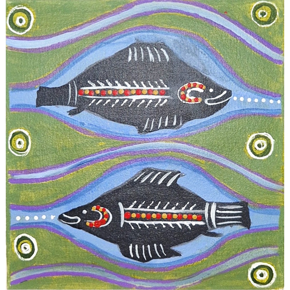 This canvas painting features 2 Fish, painted by local indigenous artist Lisa Smith.